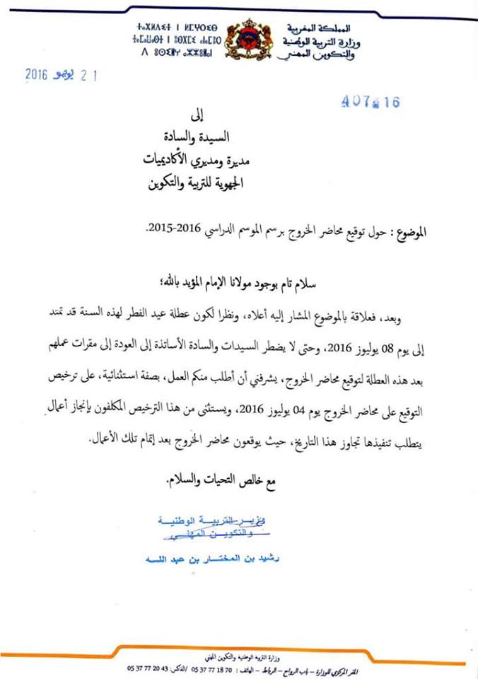 توقيع محاضر الخروج بالنسبة للموسم الدراسي الحالي يوم 04 يوليوز 2016 مشاهدة المذكرة
